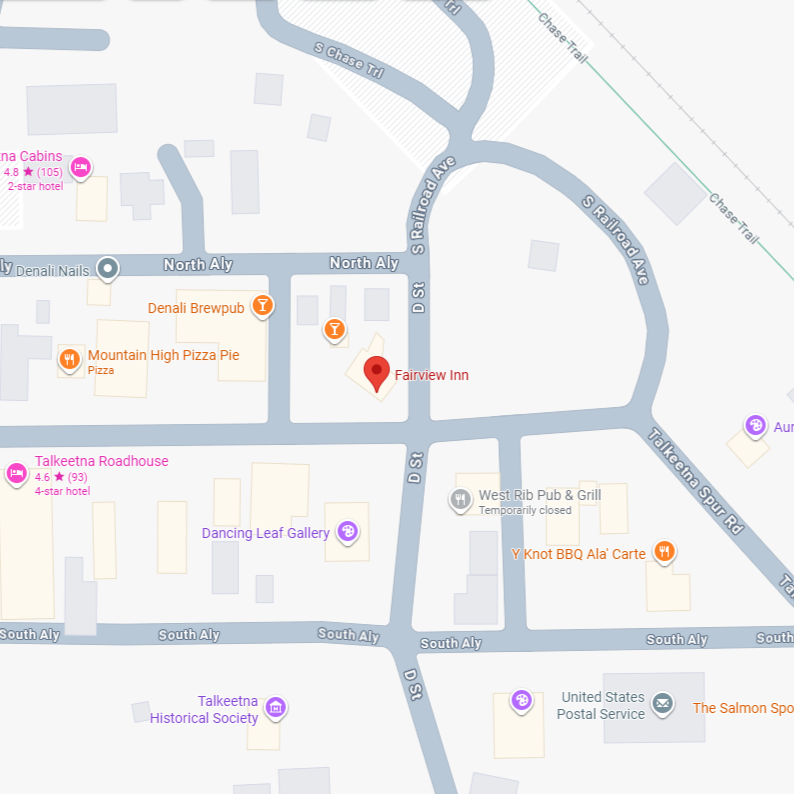 If you are coming from the train, follow these directions: Exit the railroad depot from the north end, turn right on Talkeetna Spur Road, walk three blocks to the stop sign, and then turn left on Mainstreet. The Fairview Inn is in the first building on your right.
